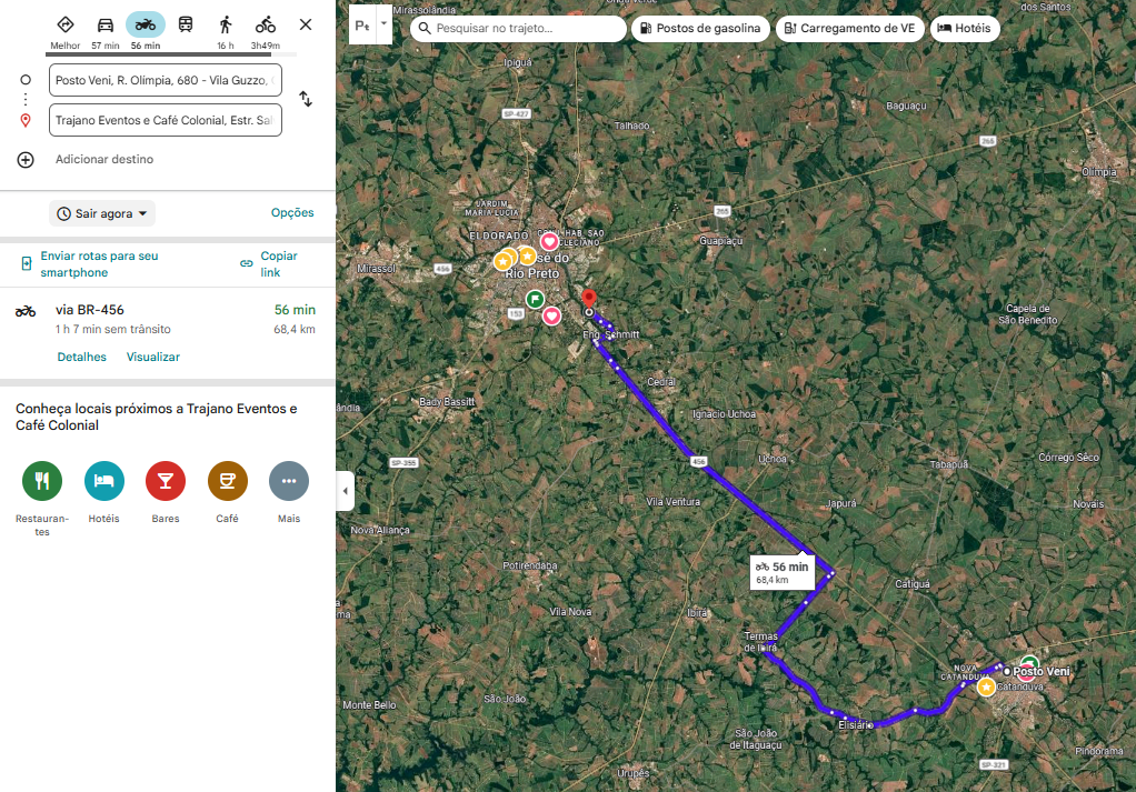 O trajeto saindo de Catanduva em direção a Elisiário é tranquilo e muiiiiiiiiito conhecido, considerado plano e com fluxo normal ou baixo, a depender do dia e horário. Se os caminhos de ida e volta forem feitos apenas pela SP-310 (com pagamento de pedágio, lembrando), haverá mais trânsito no sábado pela manhã. No entanto, esse tipo de rolê costumamos fazer aos domingos, então será bem mais tranquilo.